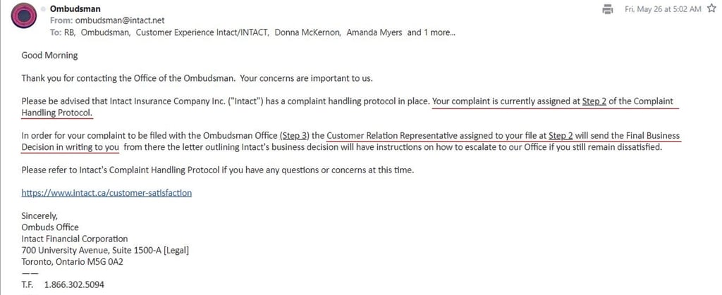 Thus, RB filed a complaint, pursuant to INTACT's 3-stage Claims Resolution protocol, which was acknowledged by INTACT's Ombuds[wo]man Michele Vincent. In said email (below) Vincent confirmed that she had assigned the Complaint to the Customer Experience Team (stage-2), for investigation and notification with a "Final Business Decision" letter.