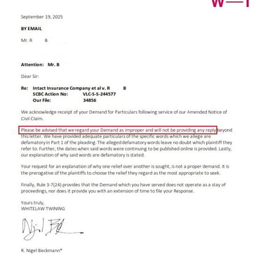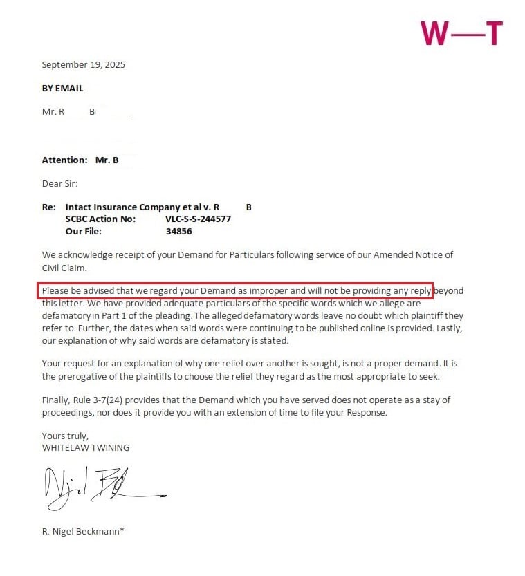 A mere six (6) days prior to the letter (to the right), INTACT's lawyer Nigel Beckmann had threatened litigation against INTACT's Insured, unless he should remove from this factual, public interest website, citation of Strata Property Act Section 155(b) and INTACT's letter of 30 September 2021, defining him as a Named Insured.