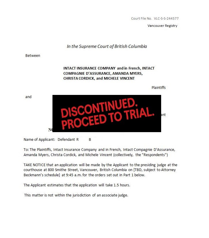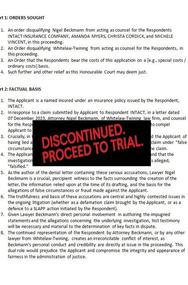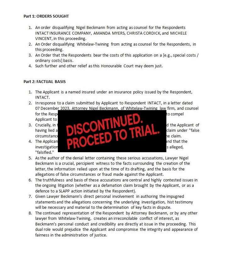 As indicated by the letter to the left, and the below legal pleading, INTACT had confirmed that RB was a Named Insured of the policy. However, as indicated by his letter to the right, INTACT Lawyer Nigel Beckmann contradicted INTACT's confirmations of RB's status, by fabrication of a false charge, defamatorily and falsely accusing RB of submission of the insurance claim under the false pretence of being an insured (letter to the right). In aggravation of the initial offence, Beckmann pugnaciously committed the tort of abuse of process, by filing two (2) duplicate civil actions against RB, for the exposure of Beckmann's wrongdoings, as well as the wrongful activities of his clients.