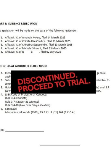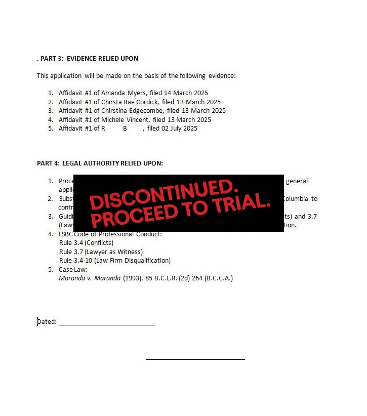 As to the requisite elements of a cause of action for the tort of abuse of process, in Oei v. Hui the B.C. Court of Appeal clarified that the tort has the three (3) elements, that are in abundance in the instant civil action: (i) a collateral and improper purpose; (ii) an overt act in furtherance of the collateral and improper purpose; and (iii) resulting loss. Stay tuned, as the cases wind their way to trial, at which Amanda Myers and Michele Vincent will be examined, under oath!