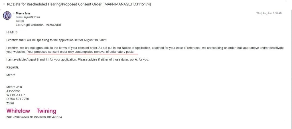 On 02 October 2024 the Justice Services Branch of BC Attorney General Niki Sharma responded to the Whistleblower's request for intervention. Although the AG generally refrains from intervention in individual cases, there are exceptions, whenever the issues of individual cases have broad public interest ramifications, such as in this case. Although the AG hasn't yet made any commitment of intervention, she has invited further submissions, assuring that the Court will apply the provisions of the Protection of Public Participation Act, infra.