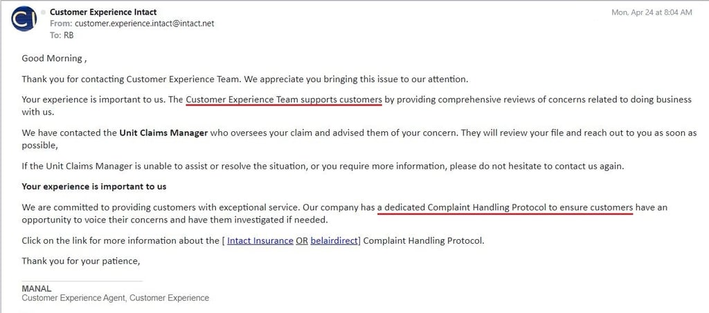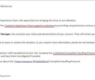Thus, RB filed a complaint, pursuant to INTACT's 3-stage Claims Resolution protocol, which was acknowledged by INTACT's Ombuds[wo]man Michele Vincent. In said email (below) Vincent confirmed that she had assigned the Complaint to the Customer Experience Team (stage-2), for investigation and notification with a "Final Business Decision" letter.
