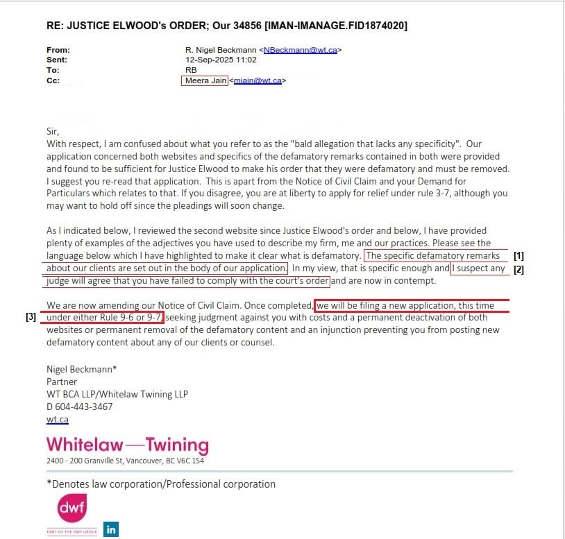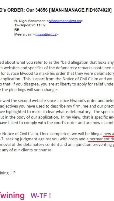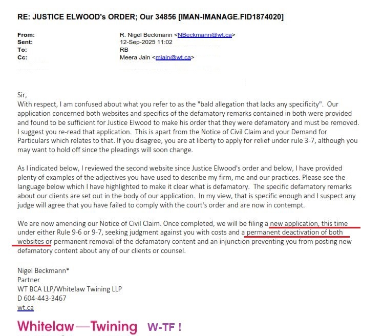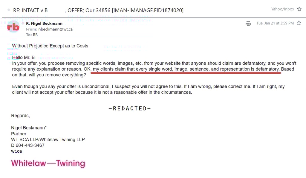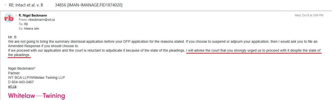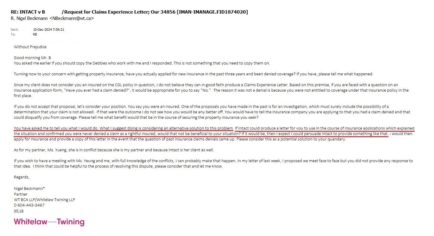 A mere six (6) days prior to the letter (to the right), INTACT's lawyer Nigel Beckmann had threatened litigation against INTACT's Insured, unless he should remove from this factual, public interest website, citation of Strata Property Act Section 155(b) and INTACT's letter of 30 September 2021, defining him as a Named Insured.