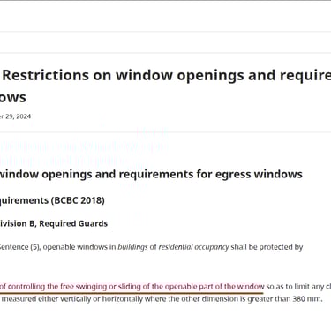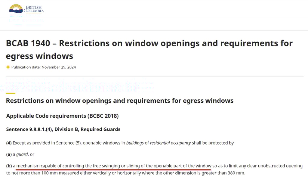The 27-year practice of bypassing window limiters violates BCBC 9.8.8.1(5). The Strata has a non-delegable duty under Section 72 of the Act to repair common property, particularly property which is not a part of any residential unit, and which is physically impossible to access, without specialised training and equipment. This is a covered claim, not an owner-funded "self-help" project.