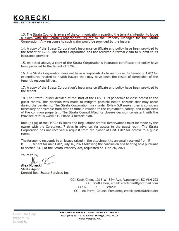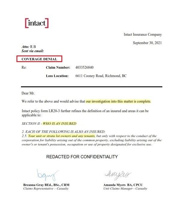OFFICIAL NOTICE: THE CLAIMANT, WHOSE COVERAGE WAS DENIED BY AMAND MYERS and BREANNA GRAY, IN THEIR LETTER OF 30 SEPTEMBER 2021, HEREBY FORMALLY REASSERTS THE SAID CLAIMS. WHICH WERE FILED ON BEHALF OF BOTH THE STRATA PLAN LMS2845 UNIT OWNER, SCOTT CHEN AS WELL AS THE TENANT CLAIMANT's.