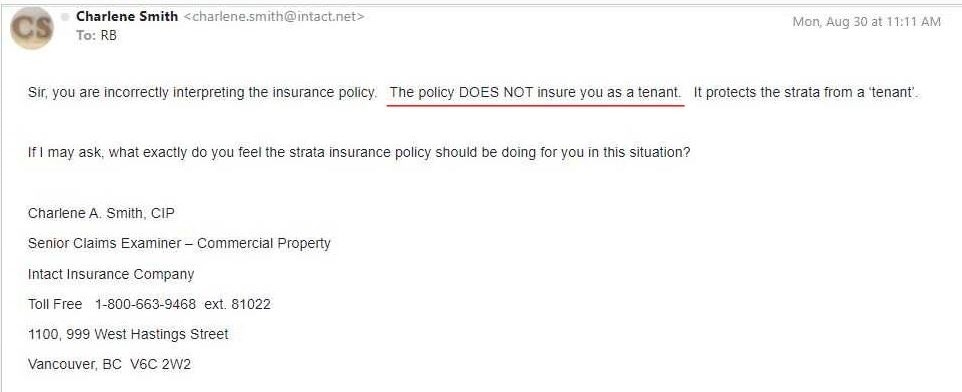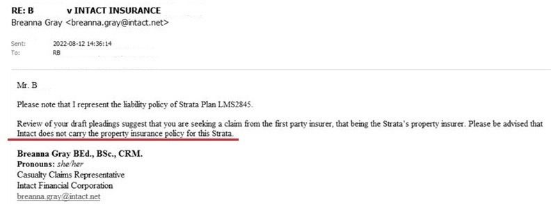 In the below email from Casualty Claims Representative Breanna Gray, she falsely claims that INTACT is not a "property insurer", in an attempt to justify a claim advanced by the Tenant of unit 1702, on behalf of his unit's Owner, Scott Chen, as well as his own.