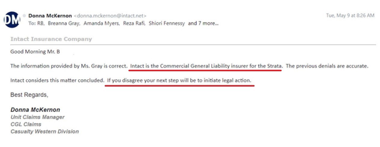In this public interest series of INTACT's bad faith scheme to deprive its insured Strata Owners of its policy coverage, for review is the below email of 28 May 2021, from Strata LMS 2845 Property Manager, Mr. Nico Barbu.