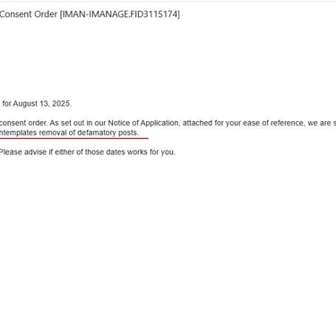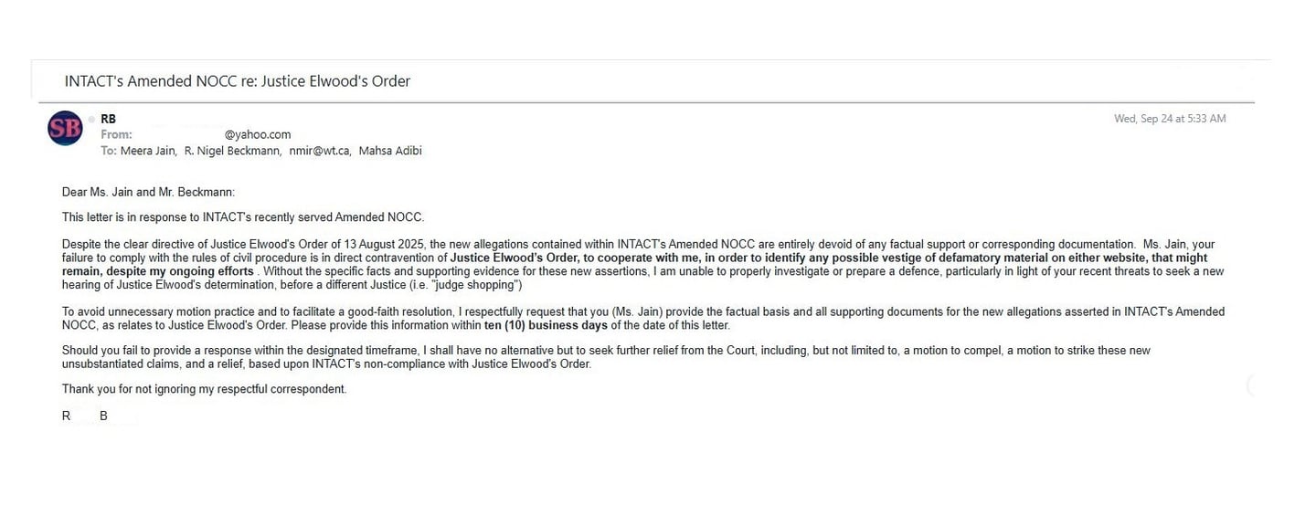 Another conscientious INTACT employée, who courageously refuses to promote the false narrative, is Senior INTACT Attorney Christa Rae Cordick, who supports the facts and the truth, by repudiating lead counsel, Nigel Beckmann, in his false, defamatory accusations, as detailed herein.