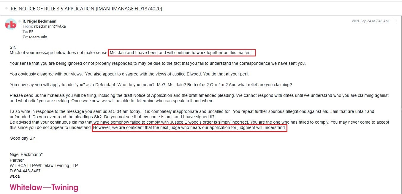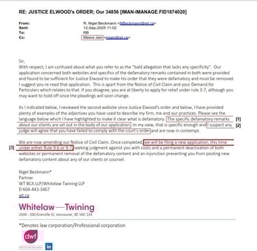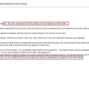The SLAPP Plaintiffs' lawyer, Meera Jain, Esqs. is a sincere, conscientious, ethical advocate, with experience at the principled, premier law firm of Clark Wilson LLP. The SLAPP Defendant first learnt of her abilities, when he viewed her informative Clark Wilson webinar about the Civil Resolution Tribunal, that she presented before the Canadian Bar Association, on 15 April 2019.