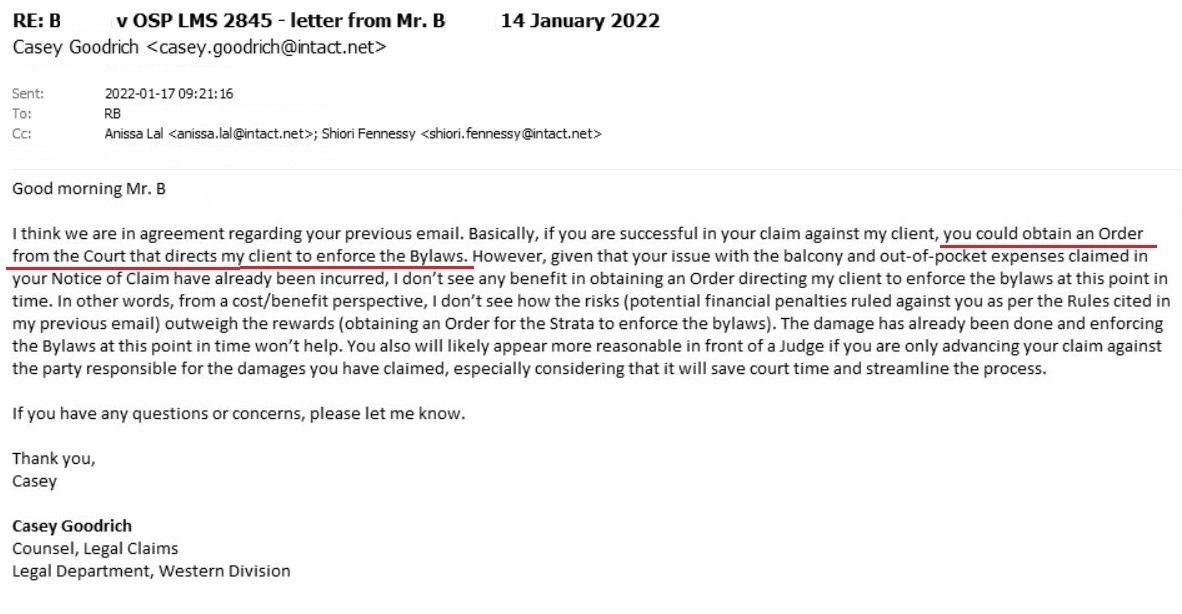 IN THE EVENT THAT INTACT SHOULD CLAIM IGNORANCE OF THE STRATA MANAGER's LETTER (below), IT WAS ATTACHED, IN ITS ENTIRETY ON PAGES 54 ~ 57 OF AN AFFIDAVIT, SWORN BY JODY PENTON, PARALEGAL OF INTACT, AND FILED IN THE PROVINCIAL COURT THREE (3) YEARS AGO, BY LAWYER CASEY GOODRICH.