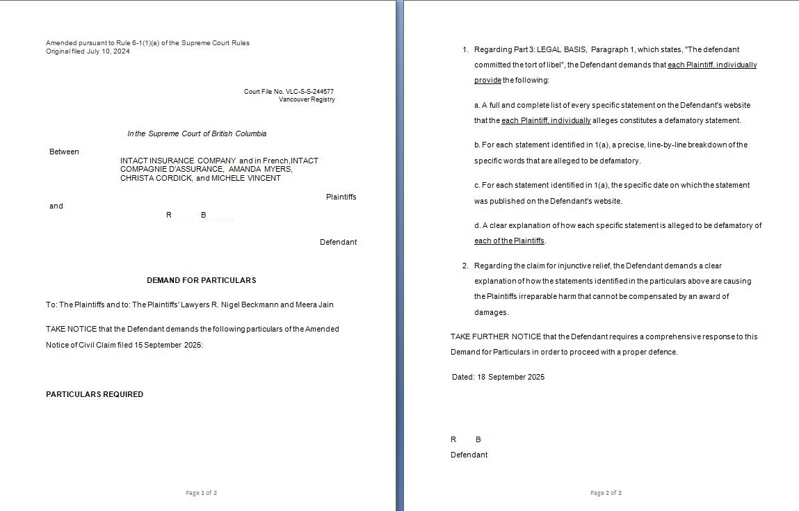 1. Not only has Mr. Beckmann contradicted all of his Clients, in their confirmations that RB was a Named Insured of INTACT, Beckmann filed two (2) duplicate civil actions against RB, in retaliation for RB's creation of this informative public interest website. 2. In a letter of 07 December 2023, Mr. Beckmann accused RB of the crime of submission of a claim with INTACT, under the false pretence of being an Insured of the company.