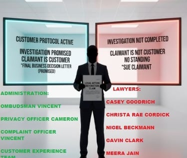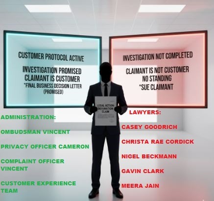 In her surreal, Kafkaesque, alter ego rôle as INTACT's OMBUDSMAN, Michele Vincent, who is not licensed as Ombudsman by any regulatory authority, has pugnaciously defied herself and her own directives, such as her Order to the Customer Experience Team to cease and desist the Step-2 investigation of RB's formal Complaint, that Vincent, herself, had commissioned, in her rôle as a licensed Complaint Officer.
