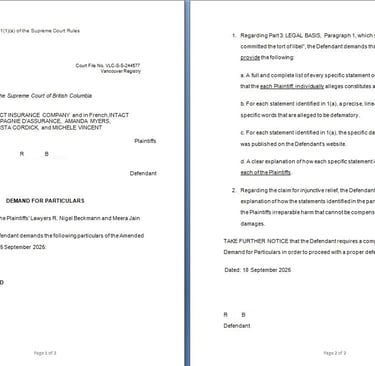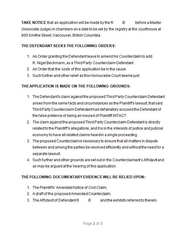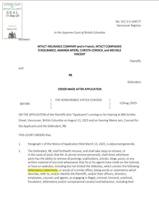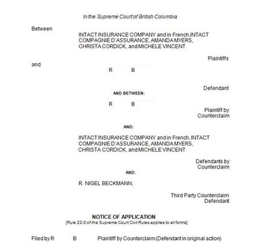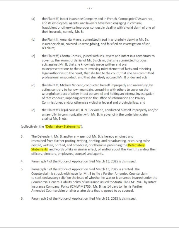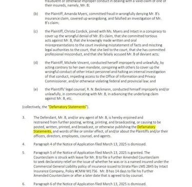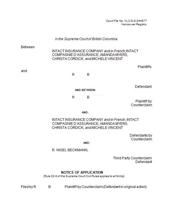 As indicated by the letter to the left, and the below legal pleading, INTACT had confirmed that RB was a Named Insured of the policy. However, as indicated by his letter to the right, INTACT Lawyer Nigel Beckmann contradicted INTACT's confirmations of RB's status, by fabrication of a false charge, defamatorily and falsely accusing RB of submission of the insurance claim under the false pretence of being an insured (letter to the right). In aggravation of the initial offence, Beckmann pugnaciously committed the tort of abuse of process, by filing two (2) duplicate civil actions against RB, for the exposure of Beckmann's wrongdoings, as well as the wrongful activities of his clients.