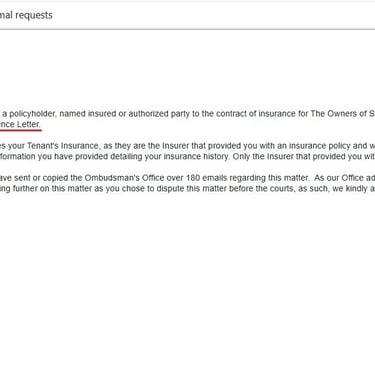 Another instance of Ombuds[wo]man Vincent's contempt for the facts, she refuses to issue a Claims Experience letter (request to the right), pretending, after almost three (3) years of INTACT's exploitation and abuse of the Insured, provincial and federal insurance regulators, OIPC, as well as the Courts, that INTACT has no records of the Named Insured!