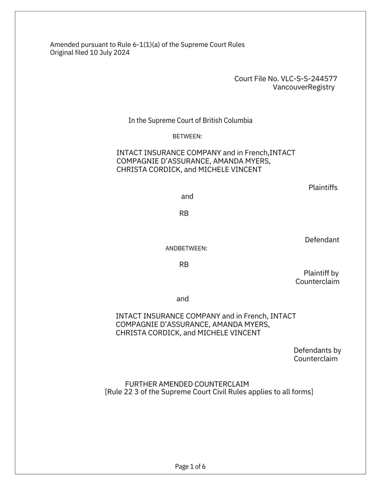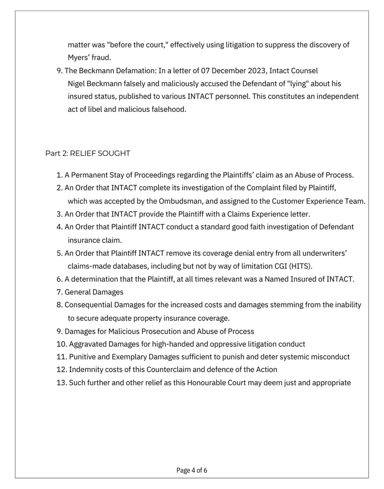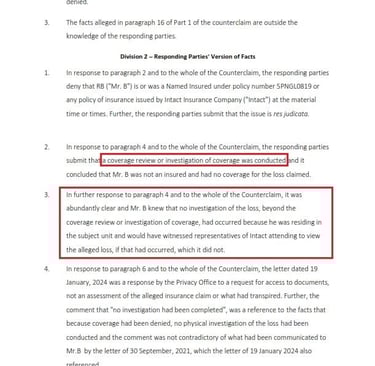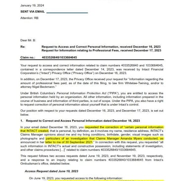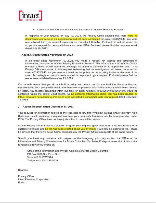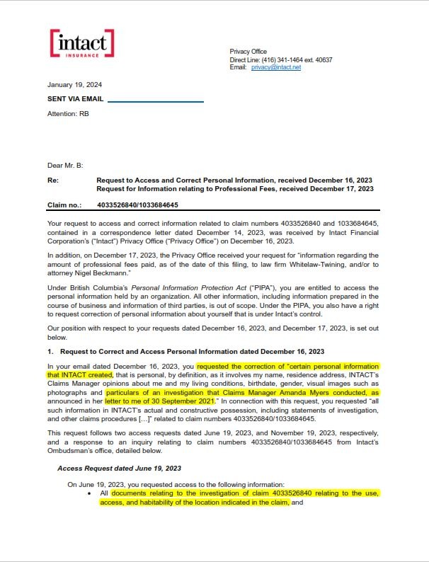 Among the most important documents for your review is the below letter of 19 January 2025, from INTACT Privacy Officer Helen Cameron, in response to my Freedom of Information Request to correct notations in my case dossier regarding Claims Manager Amanda Myers' letter of 30 September 2021, wherein she falsely claimed to have investigated my claims (4033526840 and 1033684645). As you come to complete your comprehensive review, please note the conclusive evidence that the initial denial of coverage for the Strata Master Policy (Commercial General Liability policy 5PNGL0819) was based upon a fabricated pretext, justifying a significant claim for punitive damages against INTACT and the other Plaintiffs.