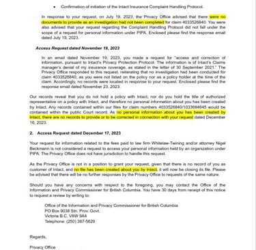 Action 2: The Admission - Intact's Privacy Office Response to Access Request., formally confirms that there are “no documents to provide as an investigation had not been completed” for this file.