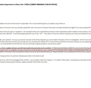 Indeed, well prior to the creation of the website, the Insured had repeatedly requested (1) that INTACT conduct a legitimate claims investigation, to replace the fabricated claims "investigation" by which (according to Privacy Officer Helen Cameron), Claims personnel Amanda Myers had wrongfully nullified the entirety of the Insured's coverage, and (2) that INTACT issue a Claims Experience letter to the Insured.