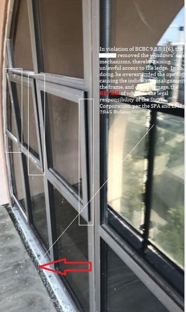 Systemic Safety Failure: The Strata Manager’s written (below) admission of a 27-year safety breach—forcing many Strata LMS2845 Owners and Tenants to access legally and physically inaccessible pigeon roost ledges, by way of removal of windows safety mechanisms, in violation of several BC Building Codes, such as 3.3.4.8.