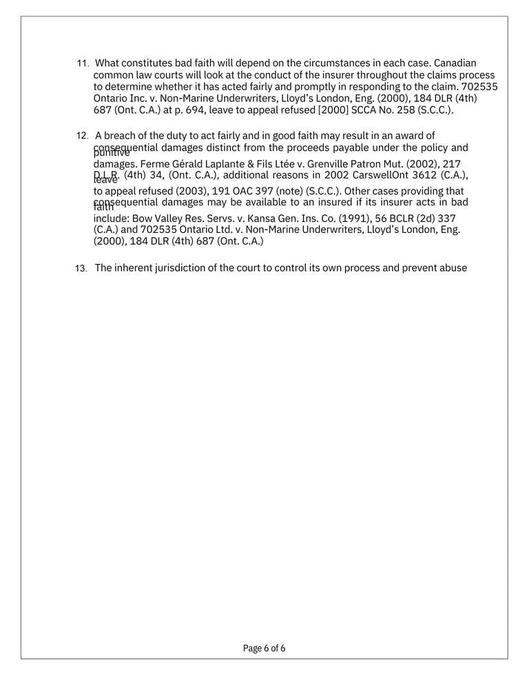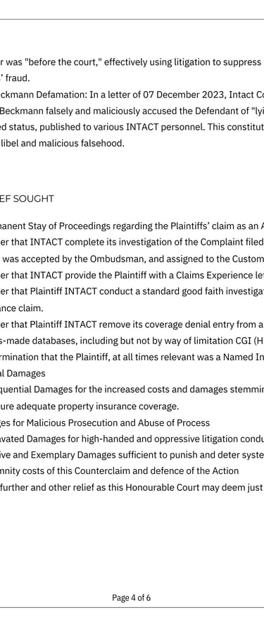 The combined evidence of internal fabrication, the active, documented sabotage confirmed by Vincent’s Letter, and the systemic enforcement confirmed by the Ombudsman’s refusal demonstrates that INTACT's conduct is "so malicious and outrageous that it is deserving of punishment" (Whiten). Counsel can confidently assert that the evidentiary threshold for a significant award of Punitive Damages has been overwhelmingly satisfied.