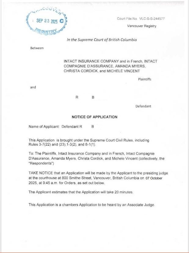 (b) In a legal filing of 19 May 2023, INTACT's Senior Legal Counsel, Christa Rae Cordick declared RB's status as a Named Insured. (c) Per the BC Strata Property Act, Section 155(b), RB has been a Named Insured of INTACT. (d) In the case of Strata Plan VR 2213 v. Schappert, 2023 BCSC 2080, the BC Supreme Court reaffirmed that all persons situated as RB, are Named Insureds of policies.