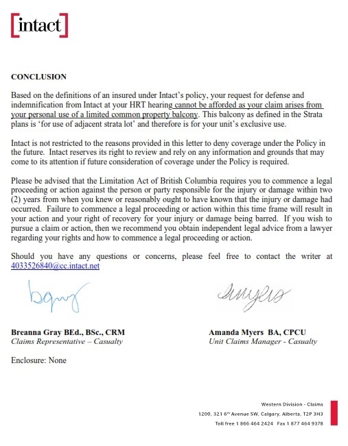 "Based on the definitions of an insured under Intact’s policy, your request for defense and indemnification from Intact at your HRT [sic] hearing cannot be afforded as your claim arises from your personal use of a limited common property balcony. This balcony as defined in the Strata plans is ‘for use of adjacent strata lot’ and therefore is for your unit’s exclusive use."