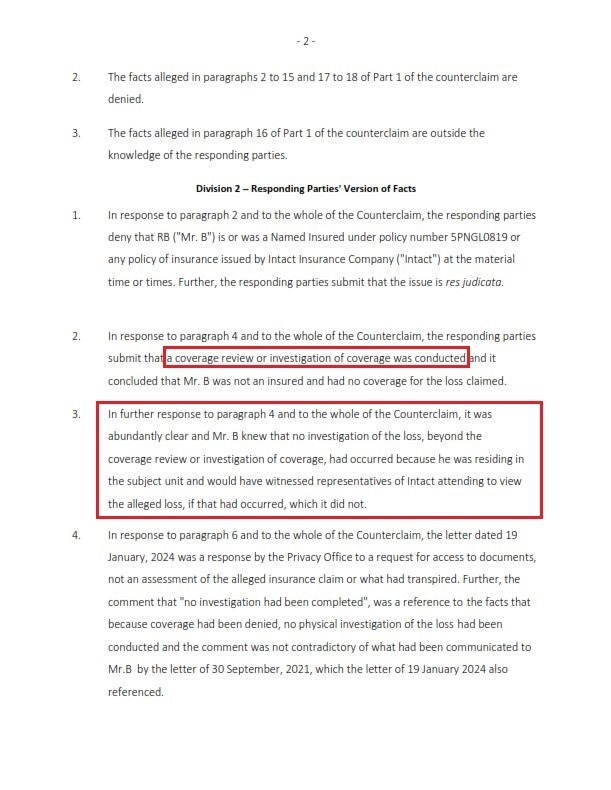 2. As a Named Insured of INTACT, RB's submission of the subject claim was acknowledged and accepted as legitimate by INTACT's aforementioned Claims Team, in addition to the other authorities.