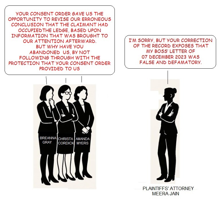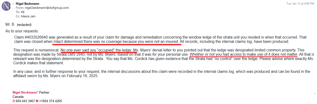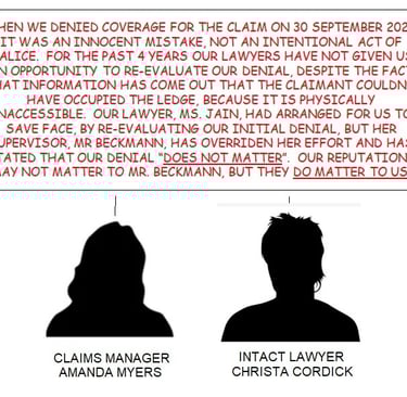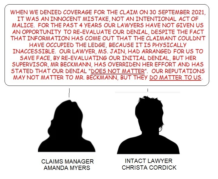 ASTONISHINGLY, IN A FUTILE ATTEMPT TO DISTANCE HIMSELF FROM THE FRAUDULENT (30 SEPTEMBER 2021) COVERAGE DENIAL OF HIS CLIENTS, CLAIMS MANAGER AMANDA MYERS AND CLAIMS REPRESENTATIVE BREANNA GRAY, THEIR LAWYER NIGEL BECKMANN HAS FALSELY STATED "NO ONE EVER SAID [THE SLAPP DEFENDANT CLAIMANT] OCCUPIED THE LEDGE", ALTHOUGH BECKMANN DID UNKNOWINGLY PROVIDE ADMISSIBLE EVIDENCE THAT MYERS' AND GRAY'S DENIAL WAS WRONGFUL, AS BEING DEVOID OF ANY LEGAL LEGITIMACY.