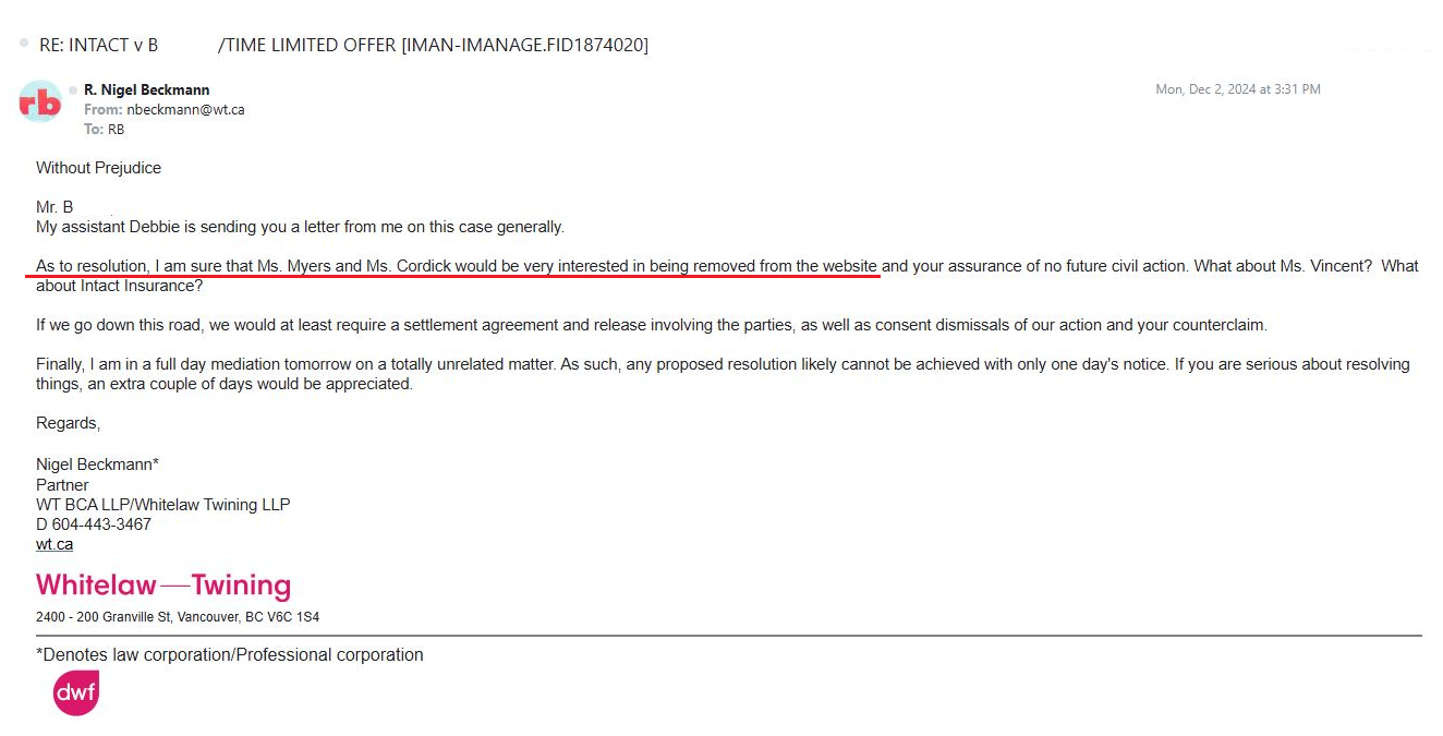 Your joint legal position contradicts the written admissions of INTACT personnel, Amanda Myers, Breanna Gray, Christa Cordick, who had affirmed the SLAPP Defendant's legal status of INTACT Insured. You are attempting to manufacture a reality that places the aforementioned personnel and Whitelaw-Twining Associate Lawyer Meera Jain, in direct criminal and ethical peril.