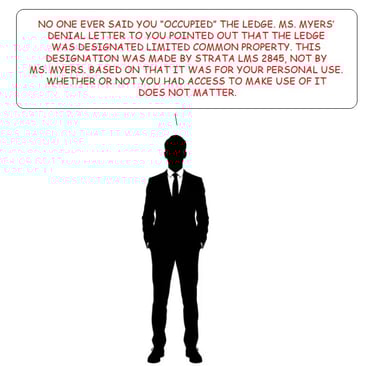 In the second paragraph, Mr. Beckmann again attempts to falsify the official records, when he states "no one ever said you "occupied" the ledge". The illegitimate basis for the denial of the SLAPP Defendant's claim was the false allegation that he had occupied the ledge, and that such occupation had triggered language exclusionary to coverage, infra. Although hardly worthy of comment, Mr. Beckmann's illogic that the fact that the ledge was inaccessible "does not matter", is belied by the fact that the Strata plan LMS2845 18th floor, indicates that the LCP designation applies, unless otherwise indicated (by the fact that the ledge is a structure, external to unit 1702, without doors, hatches of other means of ingress/egress)
