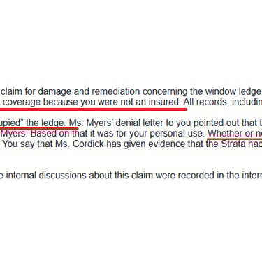 The Fraud: Goodrich and Cordick filed Provincial Court and Supreme Court pleadings, falsely claiming that Strata LMS 2845 had no responsibility or control over the inaccessible, exterior ledge. Cordick elevated INTACT's exposure with her perjured sworn Affidavit, which Whitelaw-Twining filed in the Supreme Court on 18 February 2025, infra.
