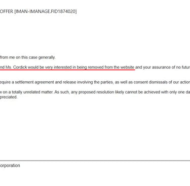 However, after one month, the firm's Partner Nigel Beckmann has reneged on Ms. Jain's agreement, thus depriving her Clients Amanda Myers and Christa Cordick a face-saving opportunity to restore their reputations.